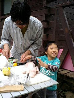 うずら先生の指導で丸鶏をしこむソタ